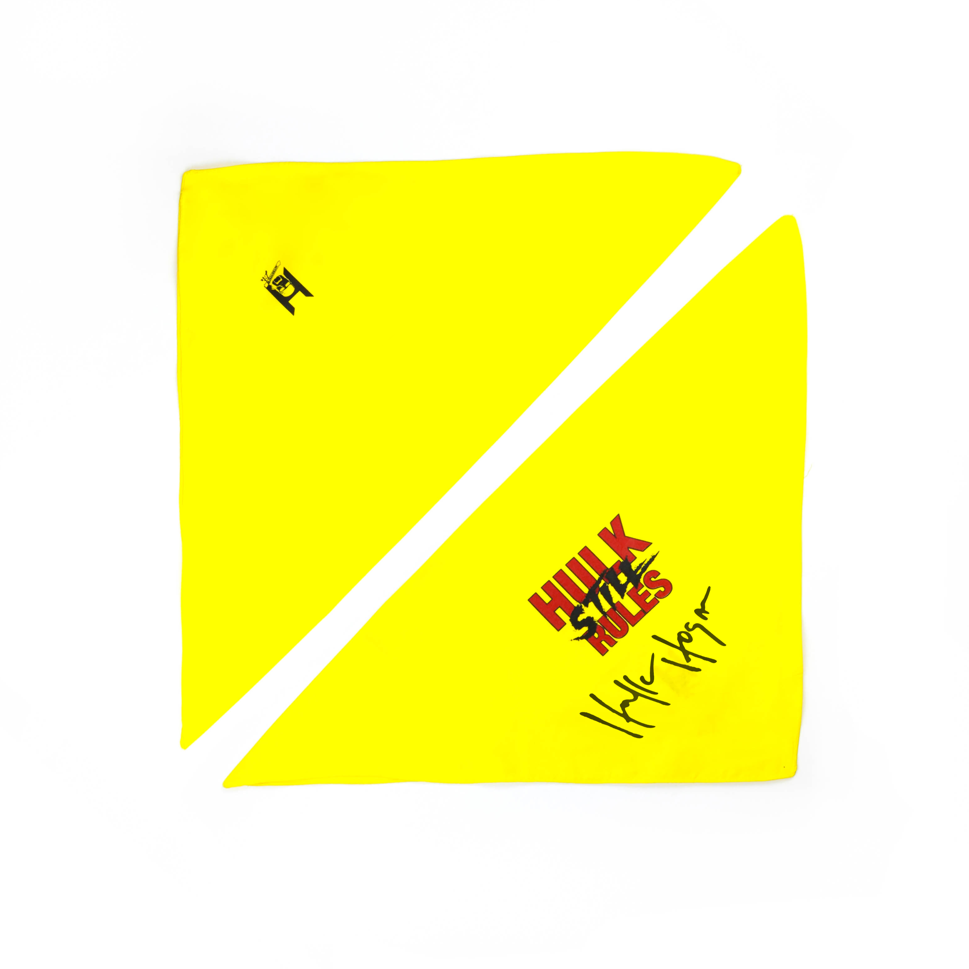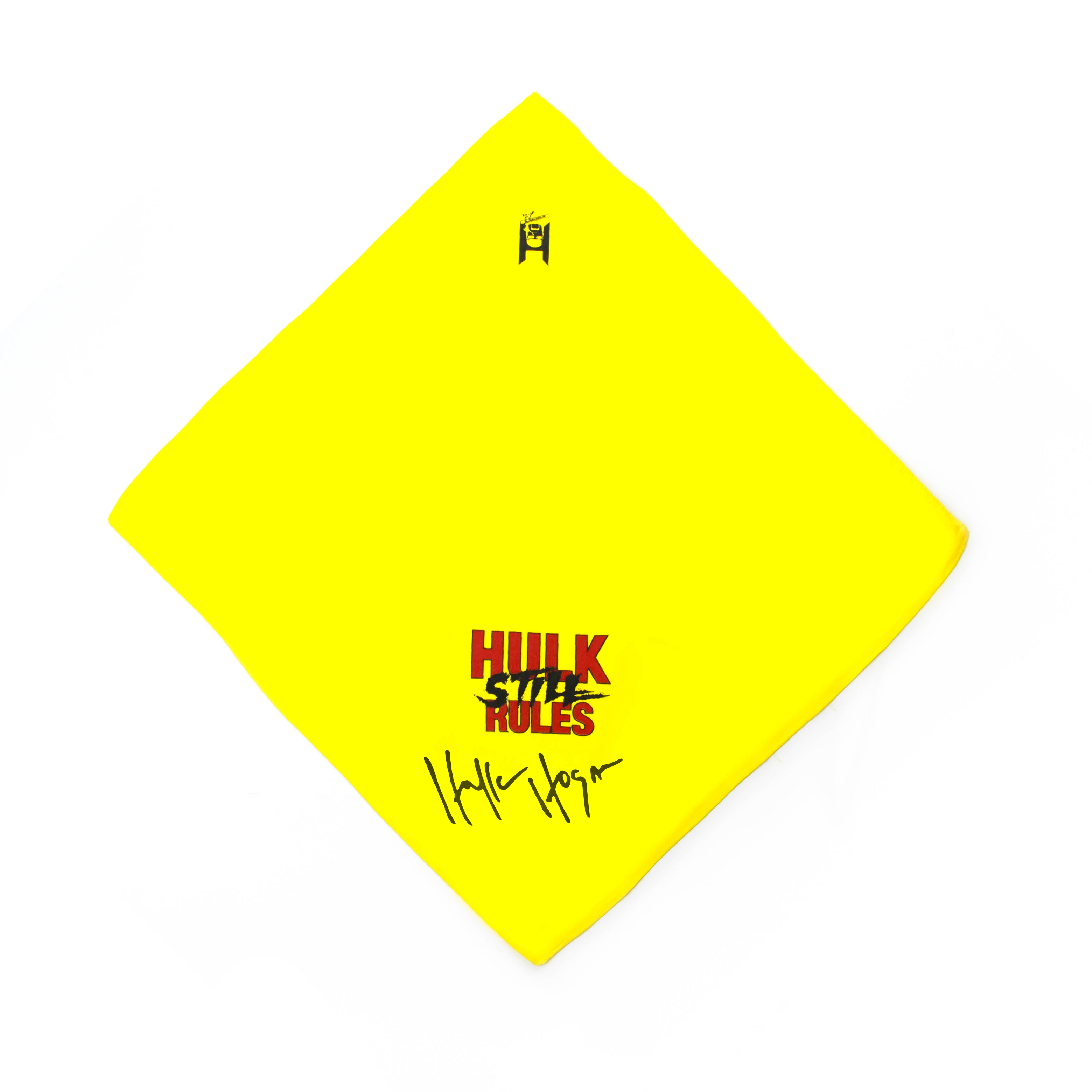 Hulk Hogan Signed Hulk Still Rules Bandana has a yellow background. The front has Hulk Still Rules printed in red and black. Whether you are hulkin’ up on the beach or slamming giants in the ring, in this bandana you can live the Hulkamaniac life. Believe in yourself, say your prayers, eat your vitamins, and train. The Power of the Mania is unstoppable, so rock this bandana with pride or tear it right down the middle. From the Greatest Wrestler of all Time to the Greatest Beach Bum of all Time, Hulk Hogan approves trips to the beach and training in the gym.