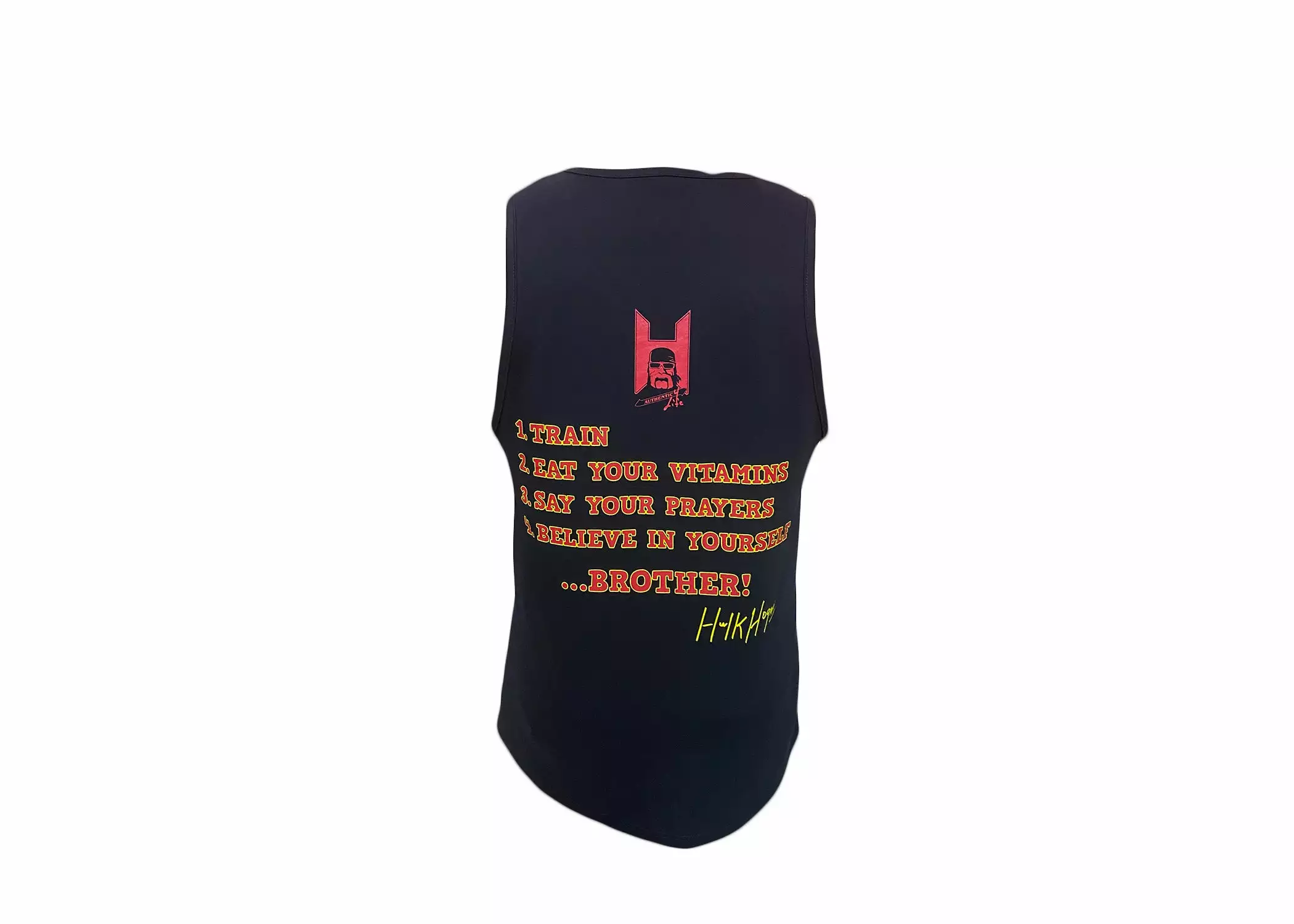 On the Back, it says the 4 rules of Hulkamania: Believe in yourself, say your prayers, eat your vitamins, and train.